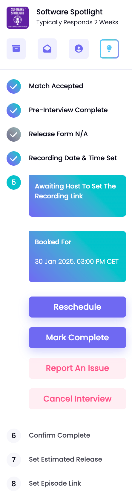 After recording the episode, both you and the host will mark this process as “Complete” and you’ll immediately be prompted to review the host.